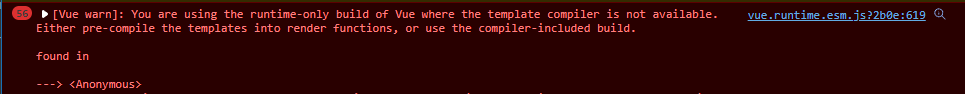 이는 Vue Cli의 설정에서, 동적 컴포넌트에 대한 컴파일 기본값이 false 이기 때문에 발생하는 것(Vue Cli : runtimeCompiler)으로써, 해결법은 간단하게 vue.config.js 파일에 runtimeCompiler 옵션을 설정해주면 된다.