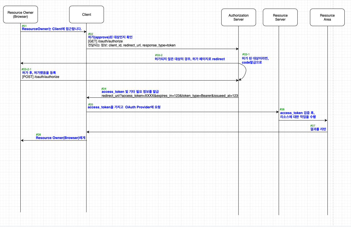 한 줄 정리를 하자면 Implicit Grant Type은, 복잡한 거 없이 Client가 토큰 발행을 요청하면 최초의 요청만으로 Authorizaton Server가 토큰을 발행한다, 로만 알아주세요.