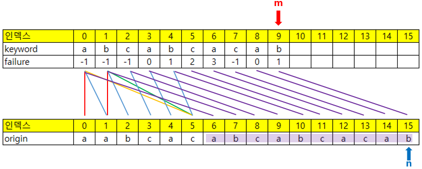 현재 origin 은 'aabcacabcabcacab'이고 찾으려는 패턴은 keyword 'abcabcacab'이다.