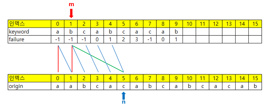 여기서 달라지는 점은 바로, 비교하는 두 값이 다를 때 failure 배열을 활용한다는 것이다.